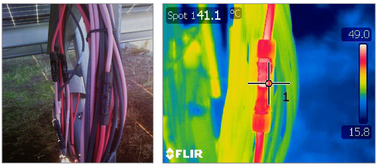 Auf der Zeichnung: links - tatsächliche Ansicht mehrerer Steckverbinder verschiedener Hersteller. Rechts - eine Infrarotkamera-Aufnahme. Eine der Verbindungen erhitzt sich, was einen Widerstand anzeigt, also einen Leistungsverlust und eine Sicherheitsgefährdung. Quelle: PVEL und Heliovolta - The Ultimate Safety Guide for Solar PV Connectors