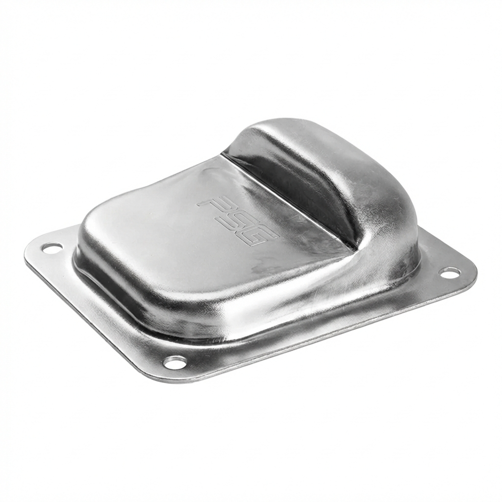 Stahlanschlag (Begrenzer) für Flügeltore, der für die Montage im Bereich des Flügelzusammenlaufs vorgesehen ist. Die robuste, gepresste Konstruktion mit vier Montagebohrungen ermöglicht eine schnelle und sichere Verschraubung mit dem Untergrund – ganz ohne Schweißen und zusätzliches Zubehör.