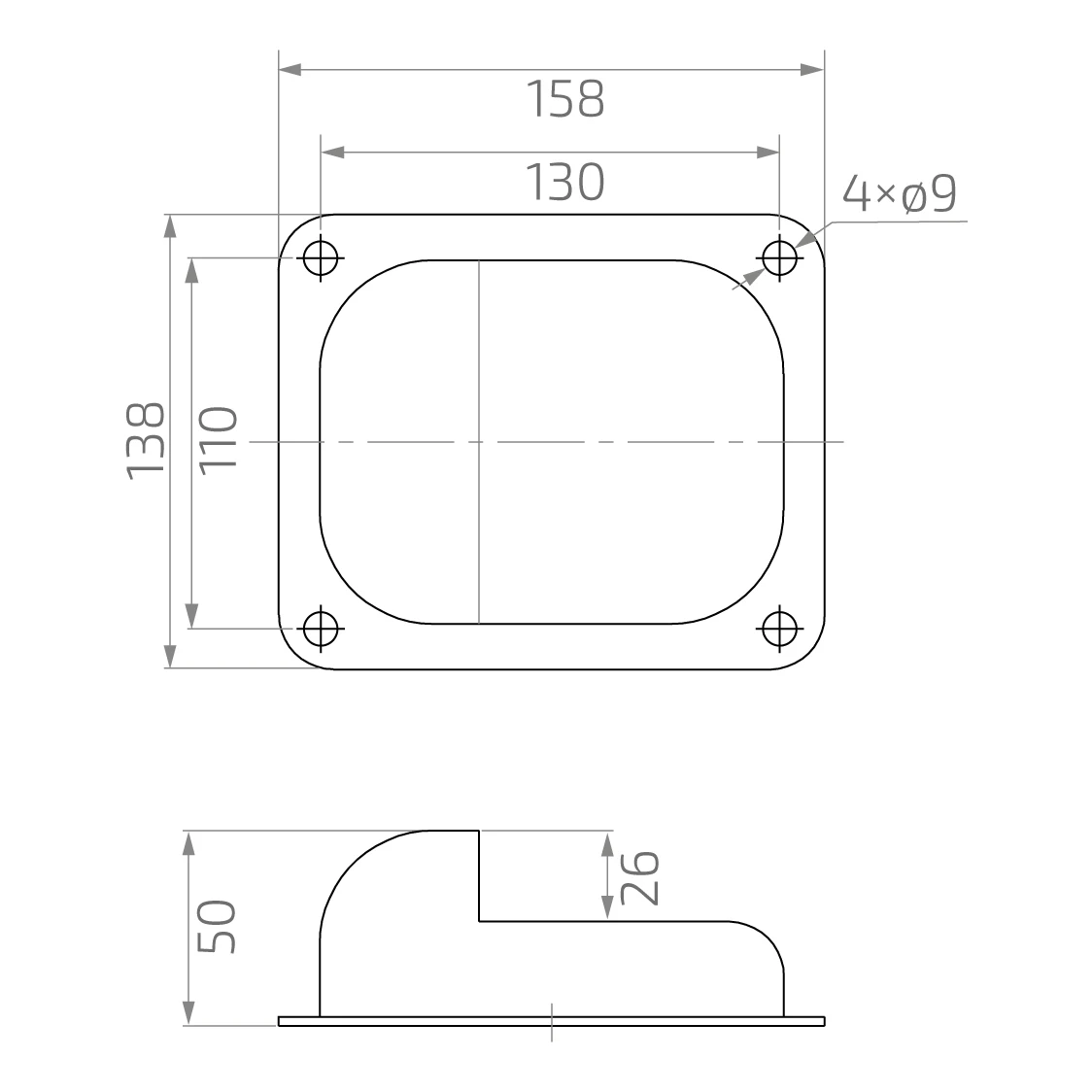 - Abmessungen der Grundplatte: 158 × 138 mm