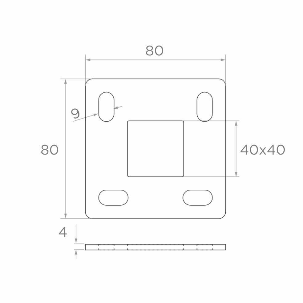 Vier ovale Montagelöcher (9×20 mm) sorgen für Flexibilität beim Verankern am Untergrund — die Verstellbarkeit der Schraubenposition erleichtert die präzise Ausrichtung des Pfostens auch auf unebenen Oberflächen. Das zentrale Loch 40×40 mm ist an das Standard-Quadratprofilsystem angepasst, was Kompatibilität mit gängigen Balusterpfosten garantiert.