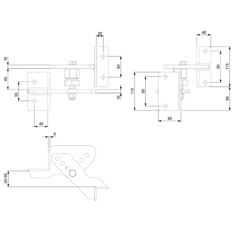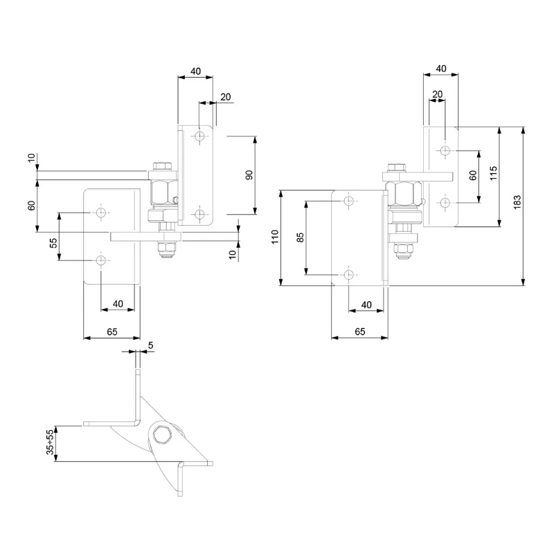 - Lochabstand der unteren Platte vertikal: 85 mm (rechte Ansicht) / 55 mm (linke Ansicht)