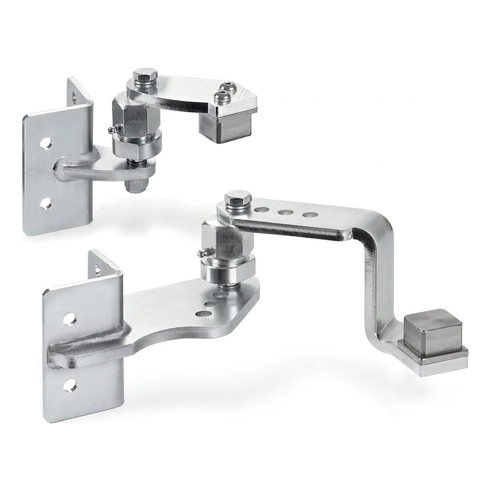 Das Set ist für die Montage durch Schweißen bestimmt – die Träger werden direkt am Pfosten befestigt und das Gelenk am Torflügelarm. Die exzentrische Einstellung ermöglicht eine Korrektur der Flügelstellung nach der Montage, was die Installationszeit erheblich verkürzt und die Notwendigkeit einer Demontage bei kleinen Korrekturen eliminiert. Die in die Gelenke eingebauten Schmiernippel gewährleisten wartungsfreien Betrieb – es genügt eine periodische Schmierung ohne Abnehmen der Scharniere.
