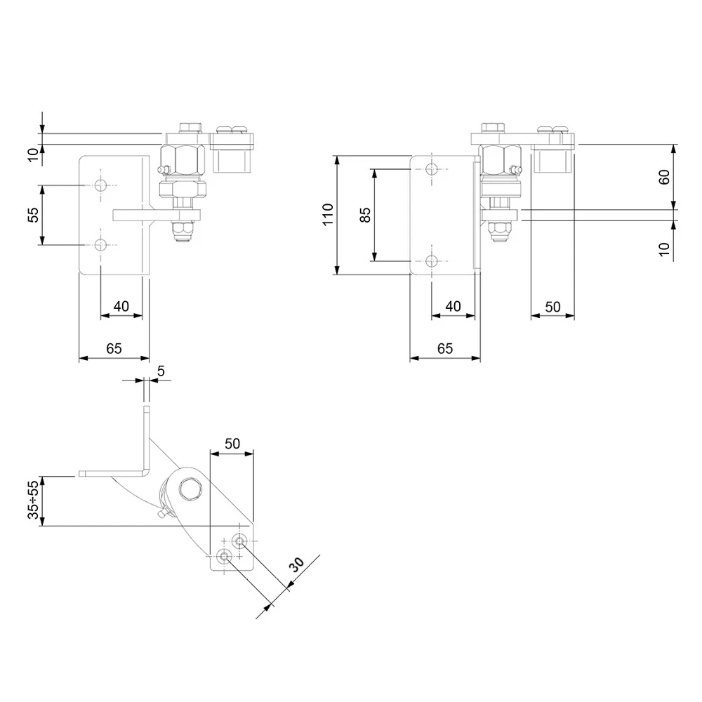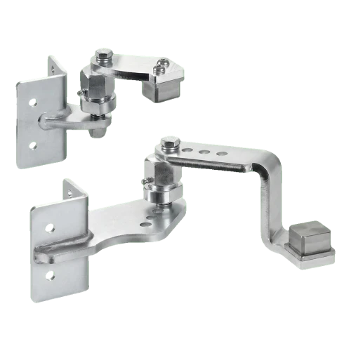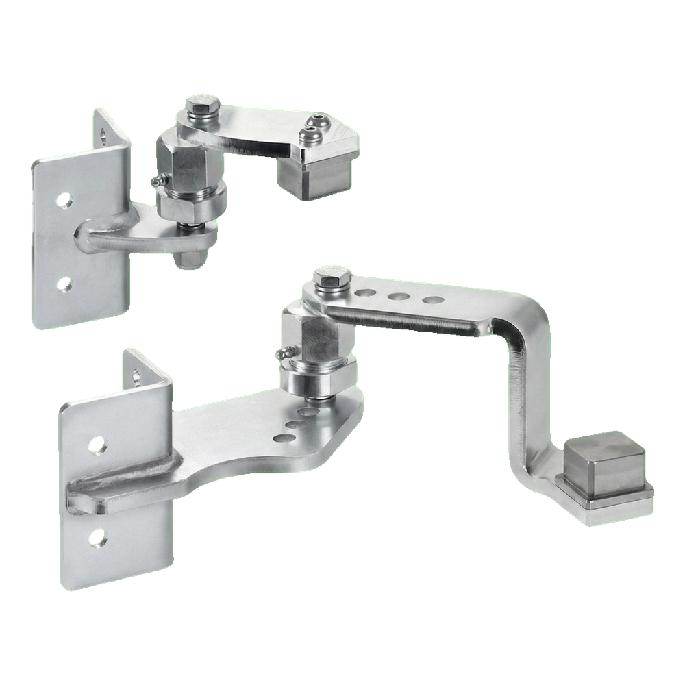 Die Scharniere sind zum Anschweißen an Stahlpfosten 50×50 mm sowie zur Montage an Betonpfosten mit Hilfe von Montagelöchern bestimmt. Der Gelenkmechanismus mit exzentrischer Schraube ermöglicht eine stufenlose Regulierung des Winkels und der Höhe des Torflügels nach der Montage — es ist keine perfekte Ausrichtung der Pfosten beim Betonieren erforderlich. Schmiernippel, die in die Gelenke eingebaut sind, gewährleisten eine einfache Wartung — regelmäßiges Schmieren reicht aus, ohne das gesamte Scharnier demontieren zu müssen.