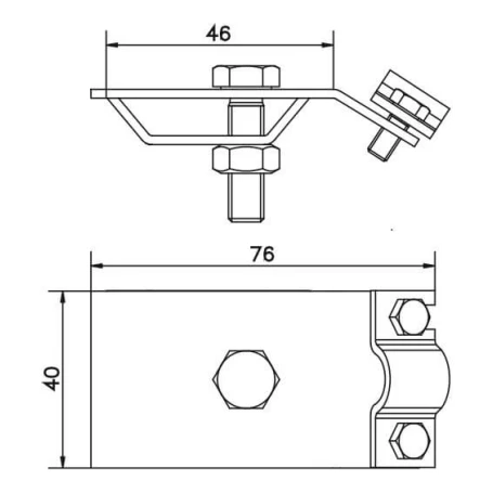 Abmessungen und Montage. Die kompakte Konstruktion (76 × 46 × 40 mm) erleichtert die Montage auch an schwer zugänglichen Stellen. Der Halter wird auf die Rinnenkante aufgesetzt und anschließend werden die Schrauben angezogen – der Blitzableiter wird sicher befestigt, ohne dass die Gefahr eines Lösens durch Wind oder Vibrationen besteht.