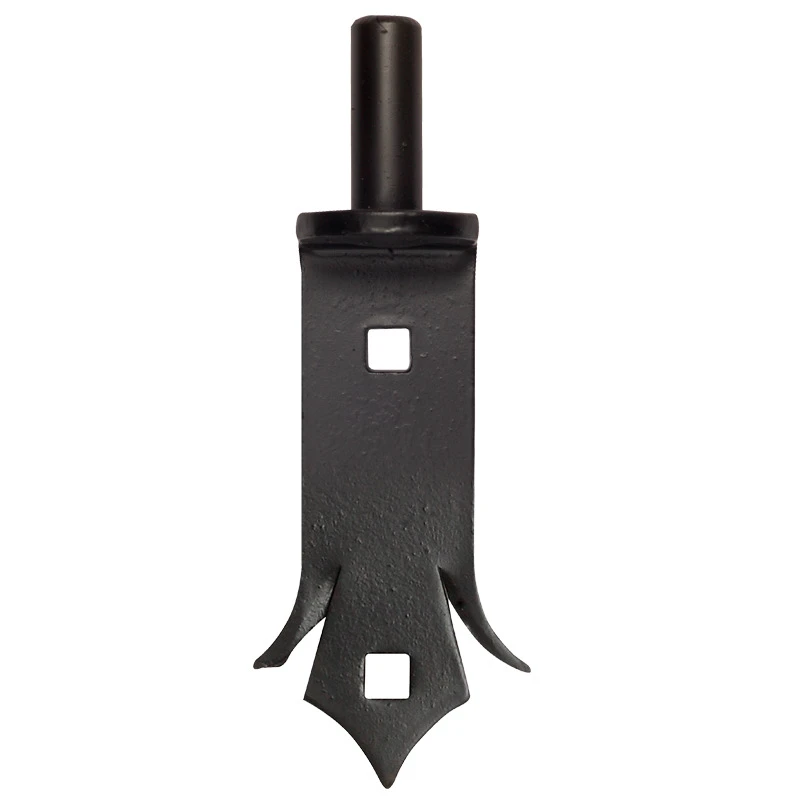 Dekorativer Bandangel-Zapfen für Flügeltore und Gartentore. Der Zapfen mit Durchmesser Ø 14 mm wird am Pfosten mittels Verschraubung montiert – zwei quadratische Montagelöcher gewährleisten eine solide und dauerhafte Befestigung. Das dekorative Profil der Montageplatte mit charakteristischer Spitze verleiht dem Tor ein ästhetisches, geschmiedetes Aussehen.