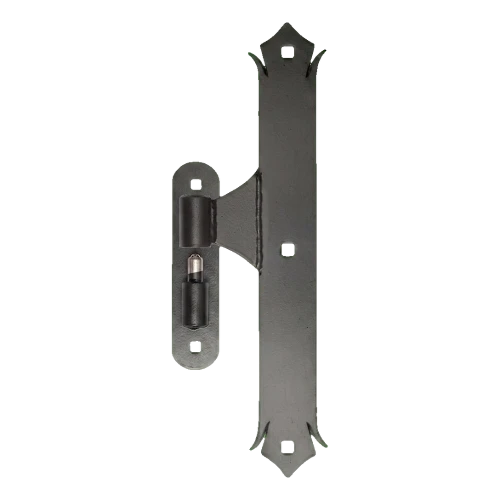 Dekorativer Torband mit Kugel für die Montage an Flügeltoren. Die dekorativen Abschlüsse des Schildes in Form stilisierter Blätter verleihen dem Tor einen eleganten, schmiedeeisernen Charakter, und die massive Konstruktion aus 5 mm Flachstahl gewährleistet Langlebigkeit und Zuverlässigkeit für Jahre. Der Torband ist mit einer Drehhülse mit Zapfen ausgestattet, was einen reibungslosen Lauf des Torflügels garantiert.