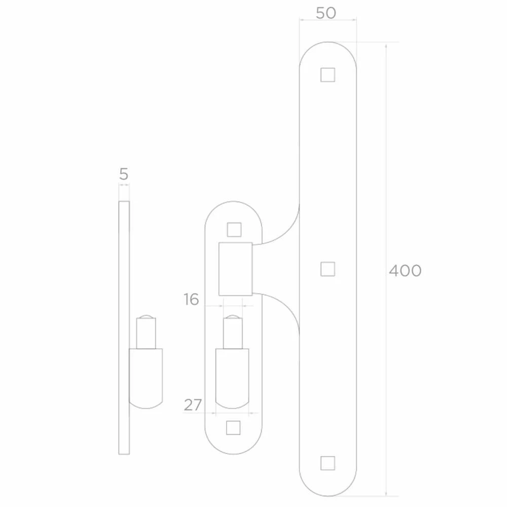 Der mittlere Torband wird an der mittleren Aufhängung des Torflügels montiert und gewährleistet eine gleichmäßige Lastverteilung. Die quadratischen Montagelöcher ermöglichen die Verwendung von Schlossschrauben, die nicht über die Schildoberfläche hinausragen und ein unbefugtes Losdrehen von der Außenseite verhindern. Dies ist eine praktische Lösung, die sowohl die Ästhetik als auch die Sicherheit der Montage erhöht.