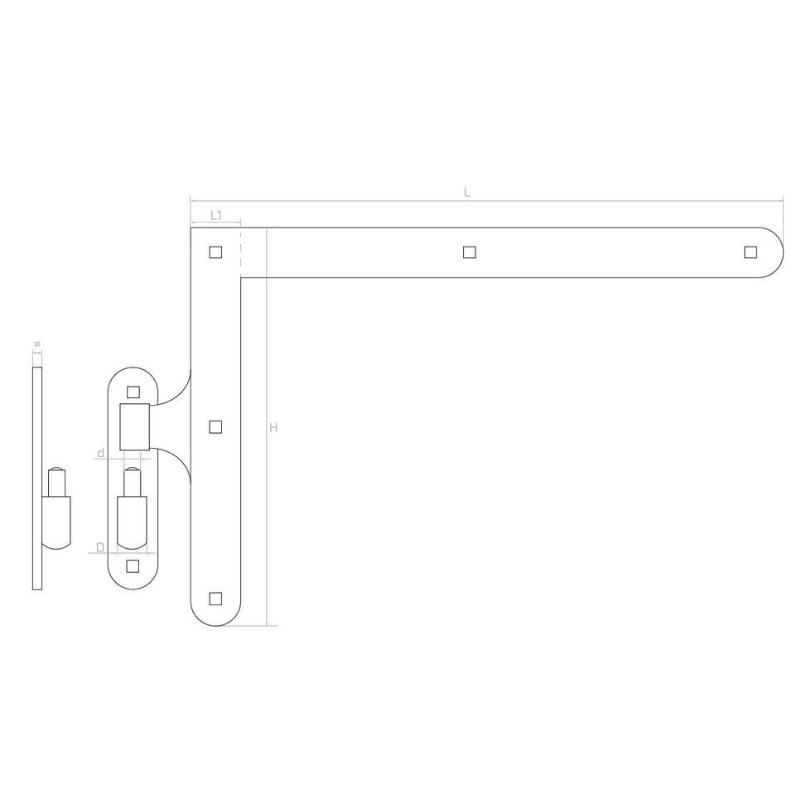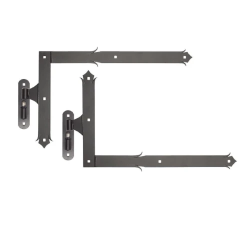Komplettsatz dekorativer Winkelscharniere mit Zapfen für die Montage großer Türen, Gartentore und Tore — besonders in Wirtschaftsgebäuden und Objekten mit traditionellem Charakter. Das Set enthält zwei Scharniere (oberes und unteres) für einen Flügel, was die komplette Ausstattung einer Montageöffnung mit einer Bestellung ermöglicht.