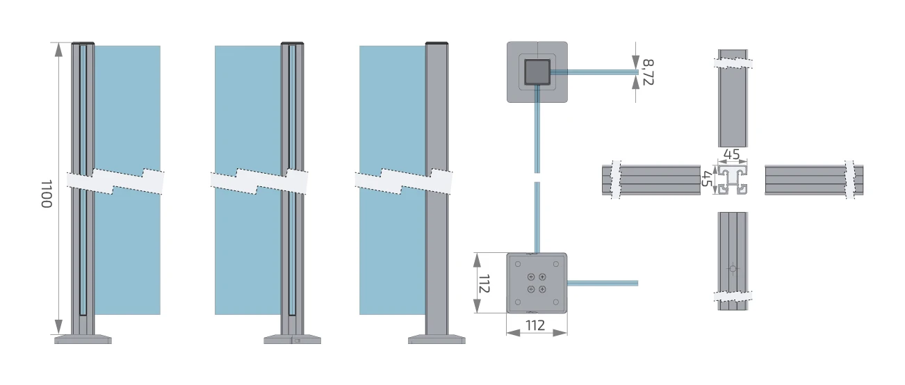 Das Profil mit Querschnitt 45×45 mm und Höhe 1100 mm ist für Verbundsicherheitsglas der Stärke 8,72 mm bestimmt. Das Bodenmontagesystem mit flacher Grundplatte 112×112 mm gewährleistet Konstruktionsstabilität und ermöglicht schnelle Verankerung in Beton oder anderen tragfähigen Untergründen. Die elegante schwarze, matte Oberfläche durch Pulverbeschichtung bietet Witterungsbeständigkeit und verleiht Balustraden einen modernen, minimalistischen Charakter.