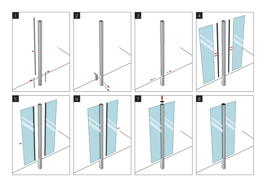 Die Montageanleitung zeigt 8 aufeinanderfolgende Installationsphasen — von der Einbettung des Profils und seiner Befestigung an der Stirnseite der Konstruktion über das Einschieben des Glases und Anbringen der Dichtungen bis hin zur Sicherung mit der Abdeckkappe. Der gesamte Prozess ist einfach und intuitiv, was eine zügige Realisierung auch großer Balustradenprojekte ermöglicht.