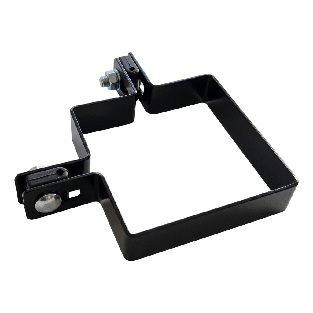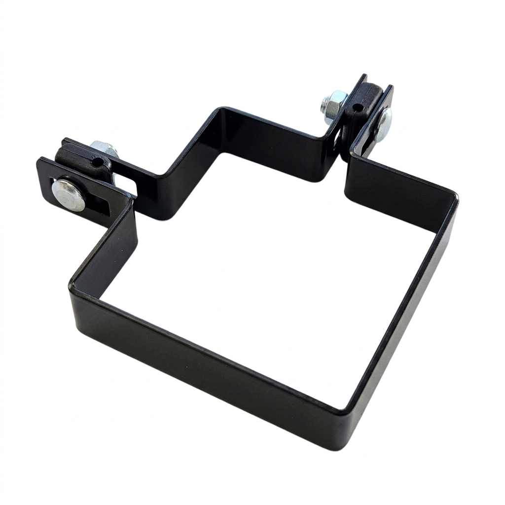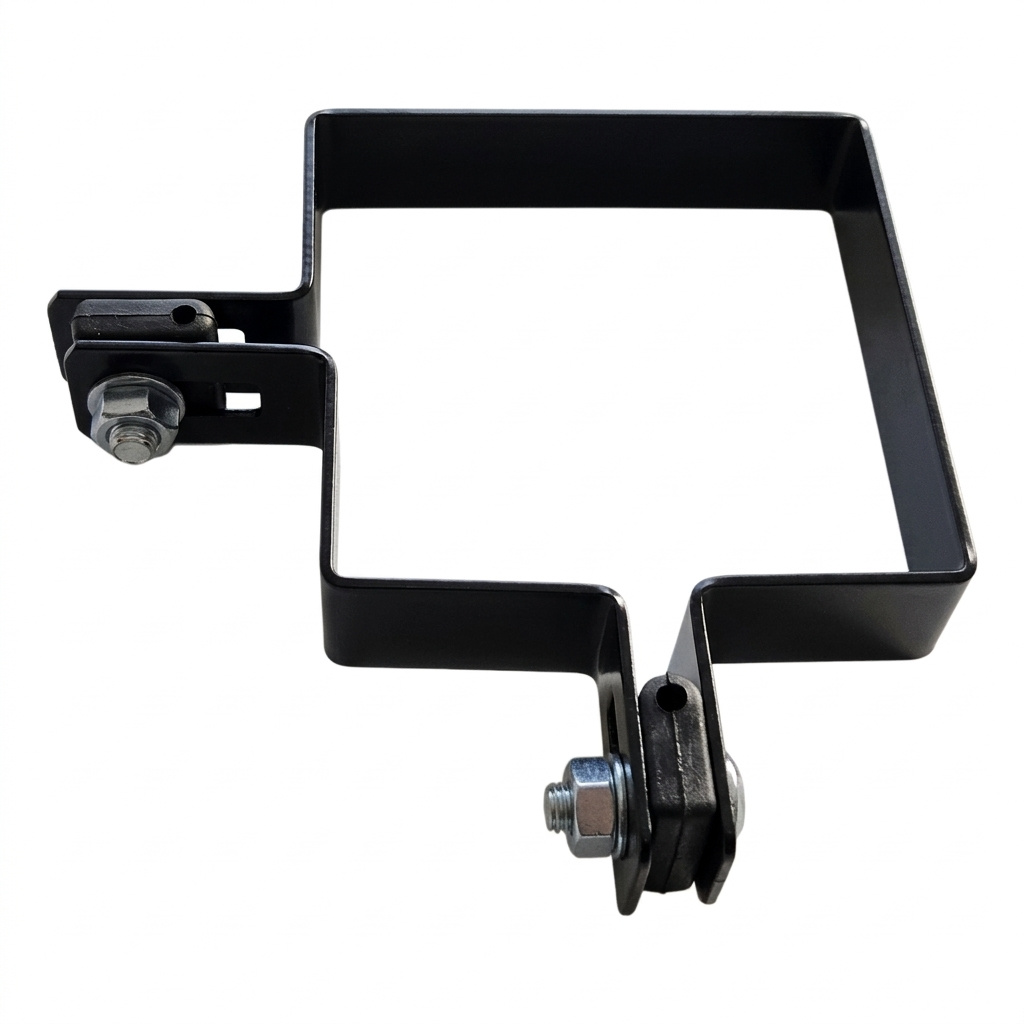 Die Schelle ist perfekt an den Pfosten-Querschnitt 100×100 mm angepasst, was eine stabile und sichere Verbindung der Zaunkonstruktion garantiert. Die bohnenförmigen Montagelöcher ermöglichen die Positionsregulierung des Paneels relativ zum Pfosten – sie erleichtern die Ausrichtung des Zauns auch auf unebenem Gelände.