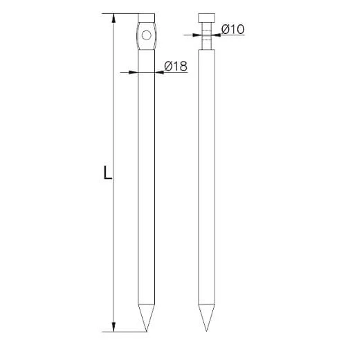 Der Anker ist zum Einschlagen in den Boden vorgesehen und dient als Befestigungspunkt für Rundleiter mit Durchmesser Ø8 mm. Die angespitzte Spitze erleichtert das Einschlagen auch in härtere Böden, und die Montagebohrung ermöglicht eine sichere Befestigung des Blitzschutzleiters.