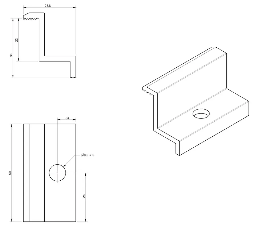Die Seitenklemme H30 Aluminium 6060 Loch M8 lackiert ist ein integraler Bestandteil der Solarmodulinstallation. Die Mittelklemme ist ein Montageelement für Photovoltaikanlagen und dient zur Befestigung des Photovoltaikmoduls am Aluminium-Strukturprofil. Sie wird für die Montage von Photovoltaik-Paneelen sowohl auf Flach- als auch auf Schrägdächern verwendet.