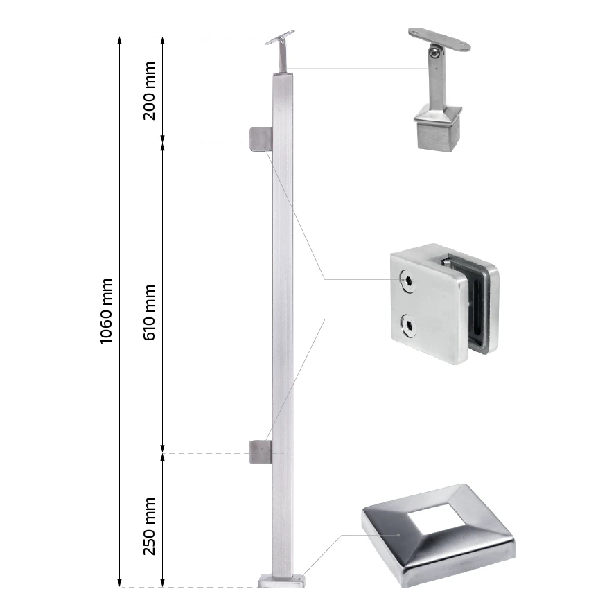 Der Pfosten ist eine universelle Lösung für Geländer mit einer Gesamthöhe einschließlich Handlauf von 1100 mm. Die Handlaufstütze ist nicht dauerhaft verklebt — für die Befestigung ist anaerober Kleber für Edelstahl zu verwenden. Diese Lösung bietet volle Freiheit bei der Montage: die Einstellung des Pfostens kann an die Gegebenheiten auf der Baustelle angepasst werden, und bei Unebenheiten des Bodens kann der Pfosten auf die erforderliche Länge gekürzt werden. Das Set enthält Gummidichtungen für 8 mm Glas — bei Verwendung von Glas anderer Stärke genügt es, die entsprechende Dichtungsgröße zu wählen.