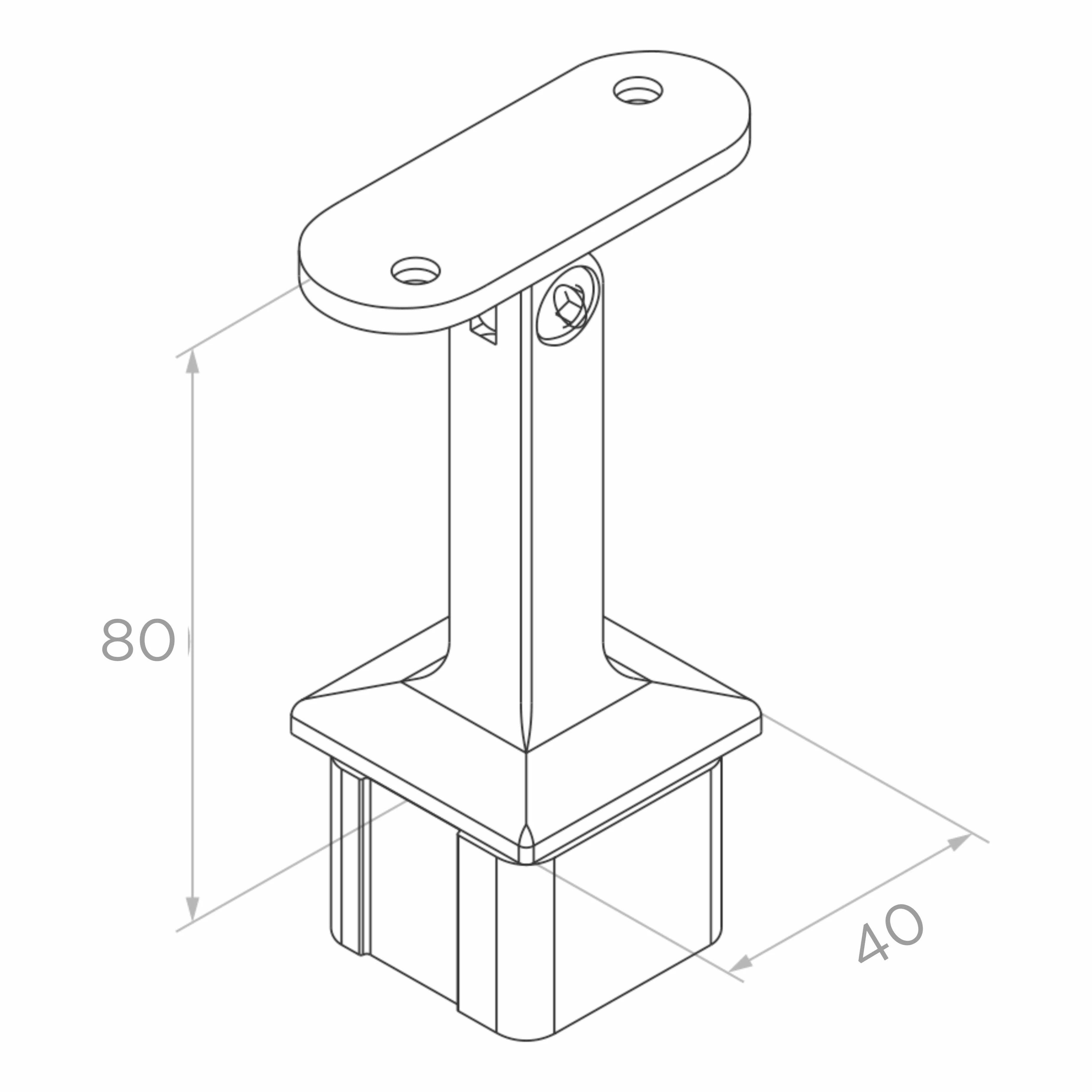 Der Pfosten wird mittels Montagefuß am Untergrund befestigt. Die Abdeckrosette verdeckt die Befestigungsstelle und sorgt für eine ästhetische Ausführung. Die Glashalter haben Montagelöcher ø 8,5 mm und werden mit Schrauben M8 am Pfosten befestigt. Die Handlaufstütze ist mit einer Neigungswinkelverstellung ausgestattet, was die Anpassung an Treppengeländer erleichtert. Durch die geschliffene Oberfläche aus Edelstahl AISI 304 eignet sich der Pfosten sowohl für Innen- als auch für Außenanwendungen.