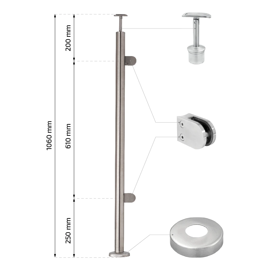 Die Glashalterungen sind symmetrisch am Pfosten angeordnet. Der Abstand von der Oberkante des Pfostens zur Achse der oberen Halterung beträgt 200 mm, der Achsabstand der Halterungen 610 mm, und der Abstand von der unteren Halterung zur Basis — 250 mm. Befestigungsbohrungen der Halterungen: 2× M8.