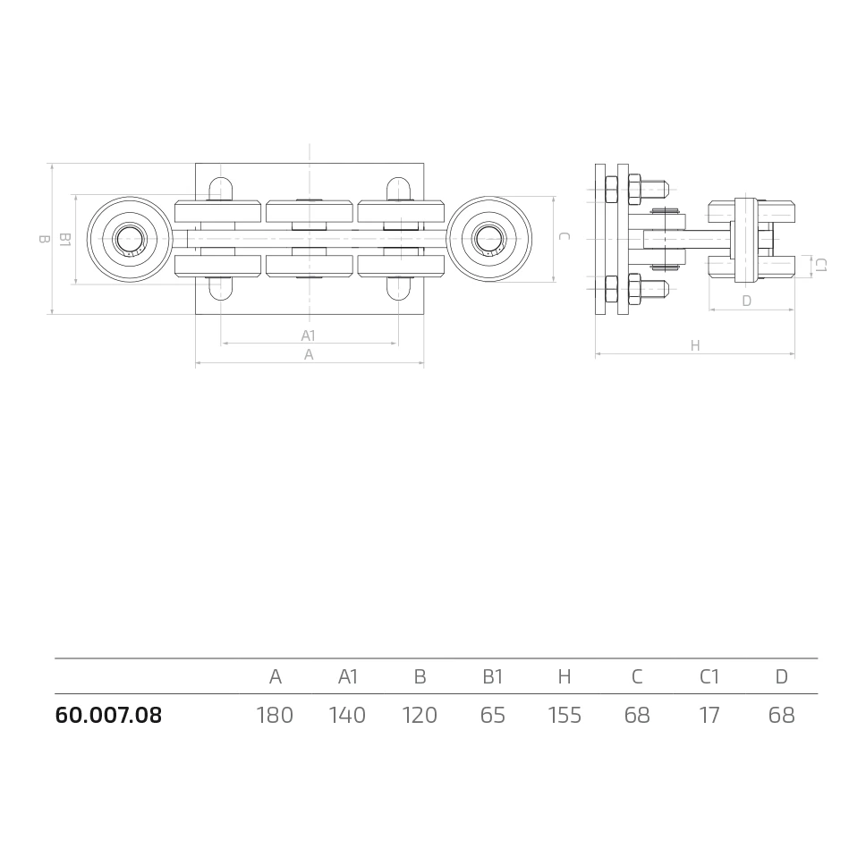 Der Laufwagen ist für die Verwendung mit einer Laufschiene 80×80×5 mm ausgelegt – einem Standardprofil, das in Schiebetor-Systemen mit hoher Tragfähigkeit eingesetzt wird. Die kompakte Bauweise und die präzise Fertigung der Rollelemente ermöglichen eine schnelle Montage und einen wartungsfreien Betrieb.