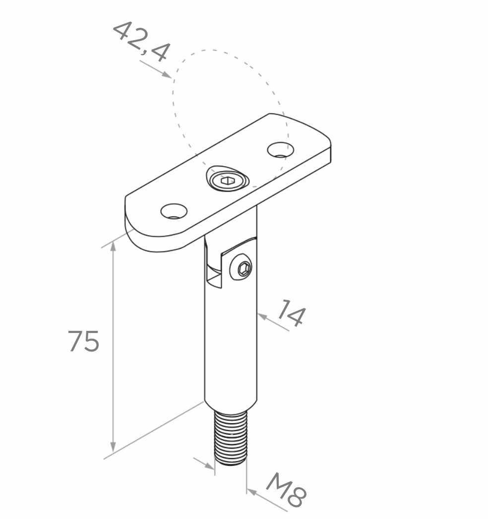 Die Gelenkstange besteht aus einem zylindrischen Schaft mit 14 mm Durchmesser und 75 mm Höhe, der mit einem Außengewinde M8 zum Einschrauben in den Pfosten oder das tragende Element abschließt. Der obere Teil ist mit einer profilierten Montageplatte ausgestattet, die für Rohre mit 42,4 mm Durchmesser angepasst ist und über Montagelöcher für eine sichere Handlaufbefestigung verfügt. Die mit einer Inbusschraube gesicherte Gelenkverbindung ermöglicht die Einstellung des gewünschten Winkels und gewährleistet nach dem Anziehen eine stabile und dauerhafte Positionierung.