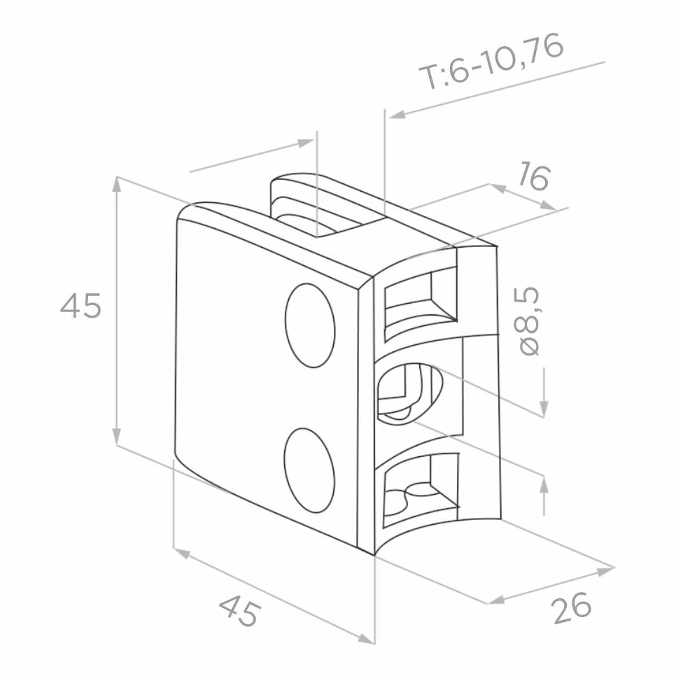 Rechteckiger Glashalter 45×45×26 mm aus Edelstahl AISI 304 in Satin-Finish. Geeignet zur Befestigung von Glasscheiben mit einer Stärke von 6–10,76 mm an Rohrpfosten mit einem Durchmesser von 48,3 mm. Das Produkt wird durch Einschrauben montiert und gewährleistet eine stabile und ästhetische Befestigung von Glaspaneelen in Geländern und Trennwänden.