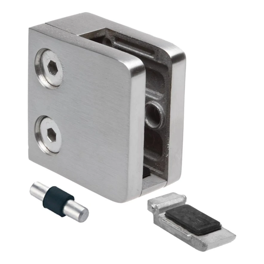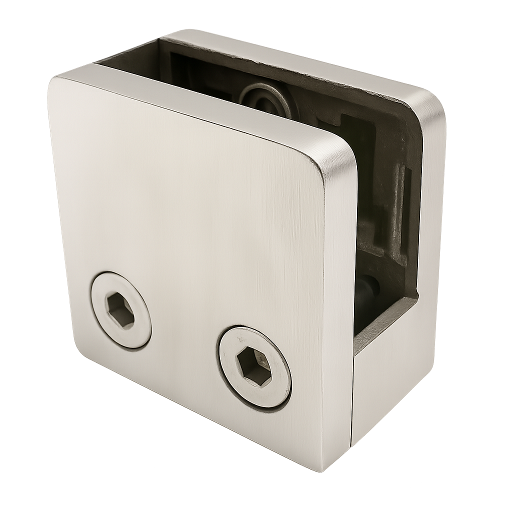 Die solide Druckgusskonstruktion aus Edelstahl gewährleistet hohe mechanische Belastbarkeit und dauerhaft ansprechende Optik. Zwei Innensechskantschrauben ermöglichen das präzise Andrücken der Glasscheibe, und das Trägersystem mit Sicherungspin garantiert eine stabile und sichere Aufnahme des Panels. Das Produkt ist für den Innenbereich konzipiert – ideal für Glasgeländer, Bürotrennwände und Duschabtrennungen.
