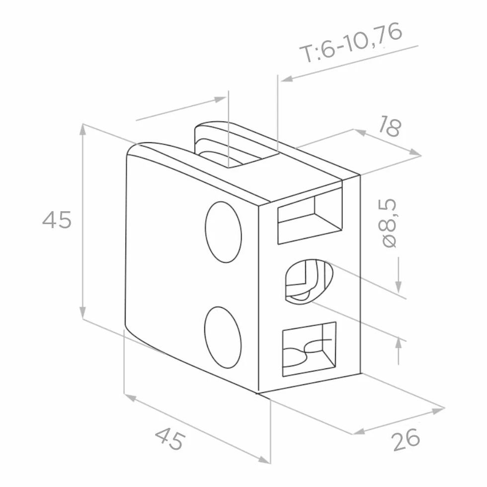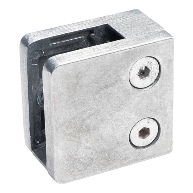 Rechteckiger Glashalter 45×45×26 mm mit Konsole und Sicherungspin — konzipiert für die Montage von Glasscheiben mit einer Stärke von 6 bis 10,76 mm in systemischen Glasgeländern. Die kompakte Konstruktion aus rohem Zamak gewährleistet eine zuverlässige Stabilisierung der Glasscheibe auf ebenen Flächen, während Inbusschrauben eine präzise Anpassung des Anpressdrucks ohne Demontage des Halters ermöglichen.