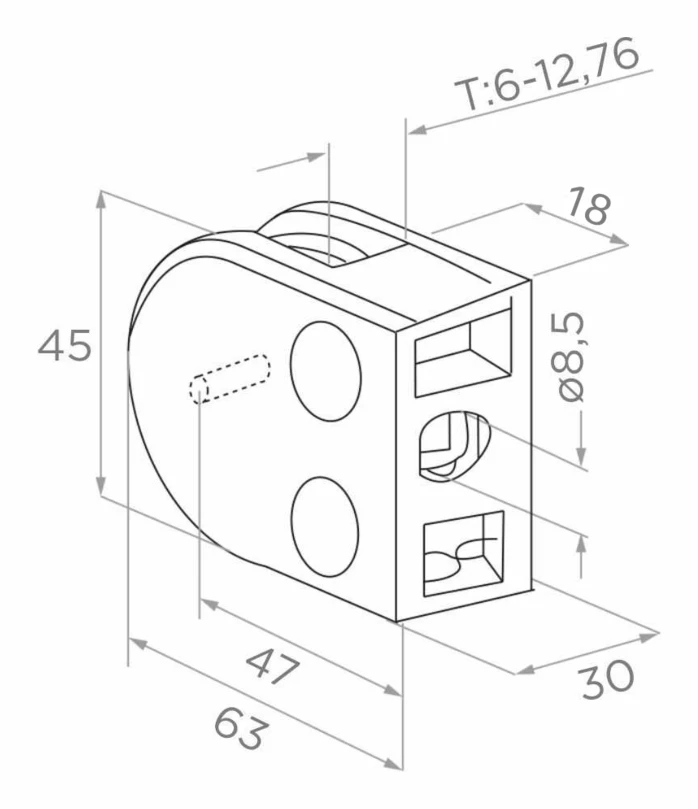 Glashalter mit Montagekonsole und Sicherungspin für Systemglasbalkone und -geländer. Dient zur stabilen Befestigung von Glasscheiben mit einer Stärke von 6 bis 12,76 mm. Die abgerundete Form des Halters wertet die Ästhetik der Konstruktion auf, während die solide Ausführung aus Edelstahl AISI 304 mit satinierter Oberfläche Langlebigkeit und Korrosionsbeständigkeit gewährleistet.