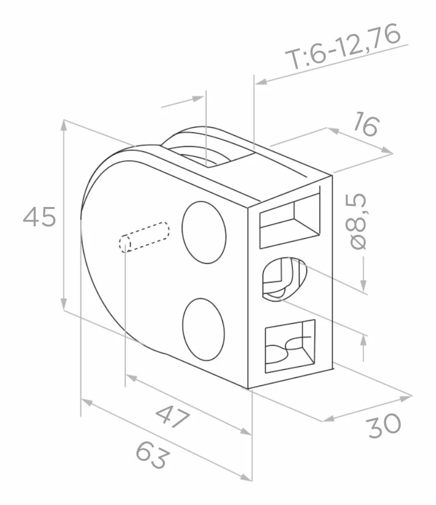 Abgerundeter Glashalter für systemische Glas- und Vollglasgeländer. Dient zur stabilen Befestigung von Glasscheiben mit einer Stärke von 6 bis 12,76 mm und sichert diese durch den mitgelieferten Sicherungspin gegen Herausrutschen. Gefertigt aus Edelstahl AISI 304 in satinierter Oberfläche — korrosionsbeständig und gleichermaßen für den Innen- und Außenbereich geeignet.