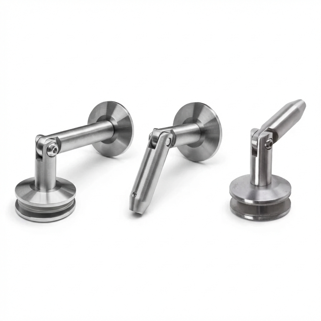 Das System besteht aus drei präzisionsgefertigten Verbindern aus Edelstahl AISI 304 in Satin-Ausführung, die für dauerhafte Stabilität und ein ansprechendes Erscheinungsbild sorgen. Jedes Element verfügt über eine verdeckte Montagebohrung, die der gesamten Konstruktion einen eleganten, minimalistischen Charakter verleiht. Das Glas kommt nicht direkt mit dem Metall in Berührung – im Set sind Andruckgummis enthalten, die die Scheibe schützen und gleichzeitig in der richtigen Position stabilisieren.