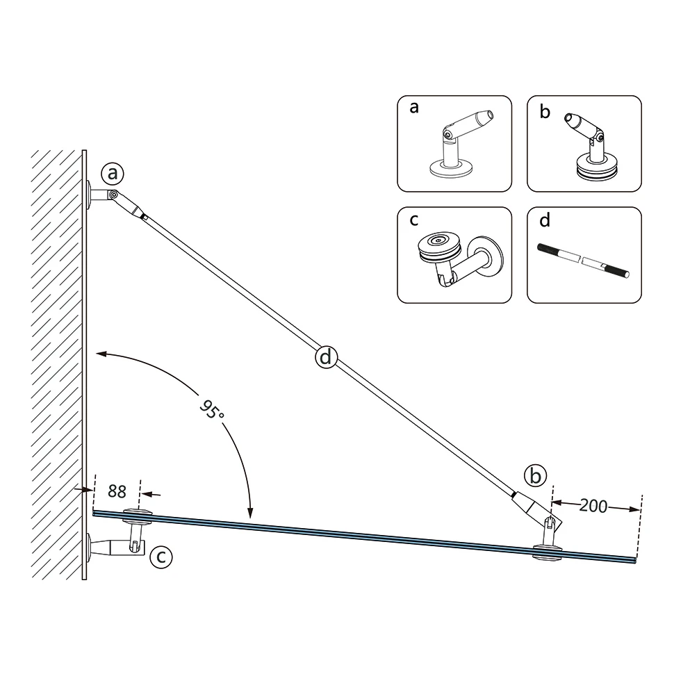 Die Zugstange wird mithilfe des Verbinders Zugstange–Wand (Element a) an der Gebäudefassade befestigt und anschließend bis zur optimalen Position des Vordachs gespannt. Der Verbinder Wand–Glas (Element c) hält die untere Glaskante in einem Abstand von 88 mm zur Fassade, während der Verbinder Glas–Zugstange (Element b) die Lasten auf die Zugstange überträgt. Der Winkelverstellbereich der Zugstange beträgt bis zu 95°, wodurch das System an verschiedene Montagebedingungen angepasst werden kann.
