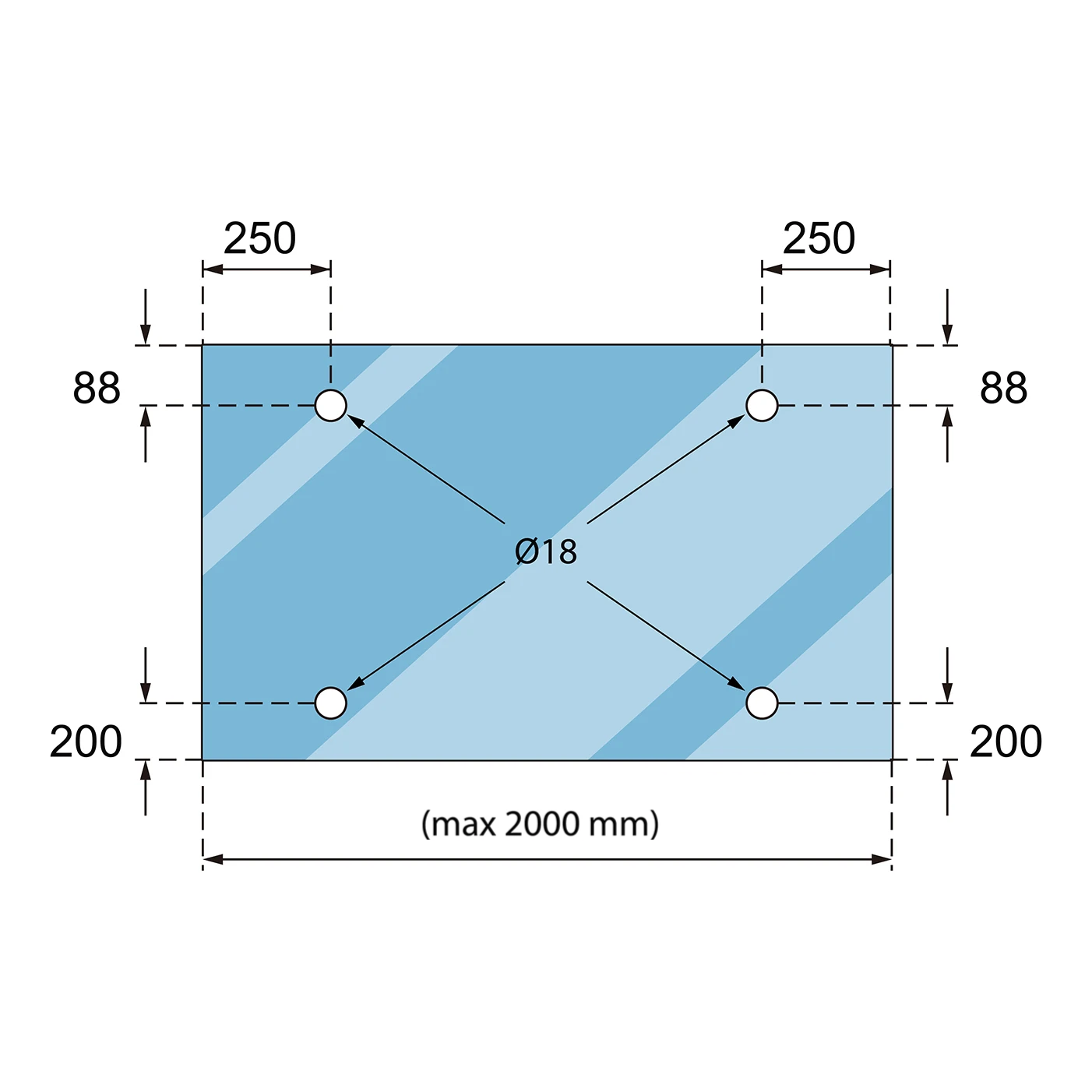 - Obere Bohrungen (Verbinder Wand–Glas): 88 mm vom oberen Rand, 250 mm von den Seitenrändern
