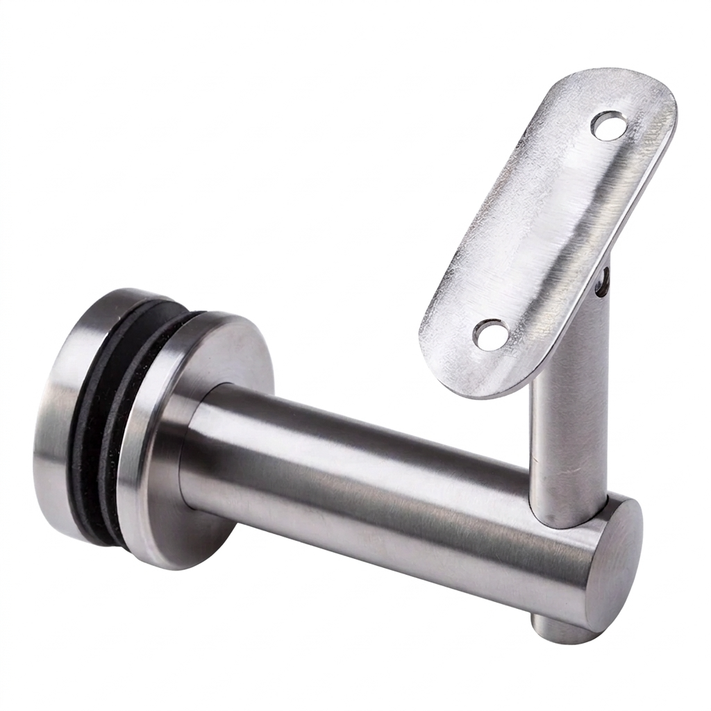 Gelenkige Handlaufhalterung für Glas mit Punktbefestigung — zuverlässiges Element für Glasgeländer im Rohrsystem Ø 42,4 mm. Dank der Gelenkkonstruktion ermöglicht sie eine stufenlose Einstellung des Neigungswinkels der Auflage, wodurch der Handlauf an Treppen, Rampen und Balkone ohne zusätzliche Adapter angepasst werden kann. Hergestellt aus Edelstahl AISI 304 mit satinierter Oberfläche — korrosionsbeständig und leicht zu reinigen, geeignet sowohl für Innen- als auch Außenmontage.