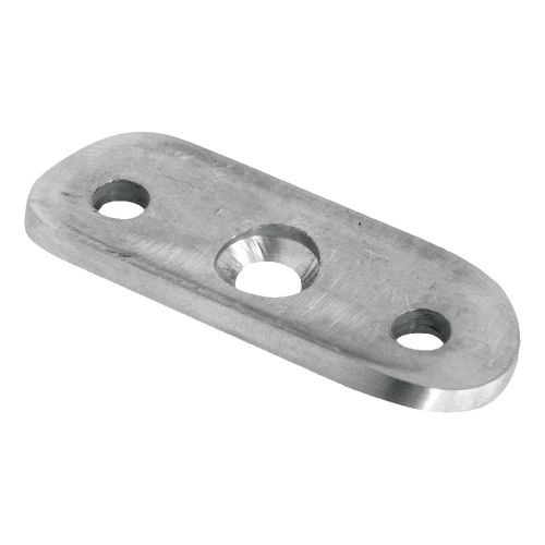 Die Unterseite der Platte ist auf den Rohrdurchmesser 42,4 mm profiliert, wodurch das Element präzise an der Handlaufoberfläche anliegt. Drei Montagelöcher (einschließlich zentralem mit konischer Vertiefung) ermöglichen sichere und dauerhafte Befestigung. Kompakte Abmessungen und geringes Gewicht sorgen dafür, dass die Platte die Geländerkonstruktion optisch nicht belastet und den minimalistischen Charakter der Installation bewahrt.