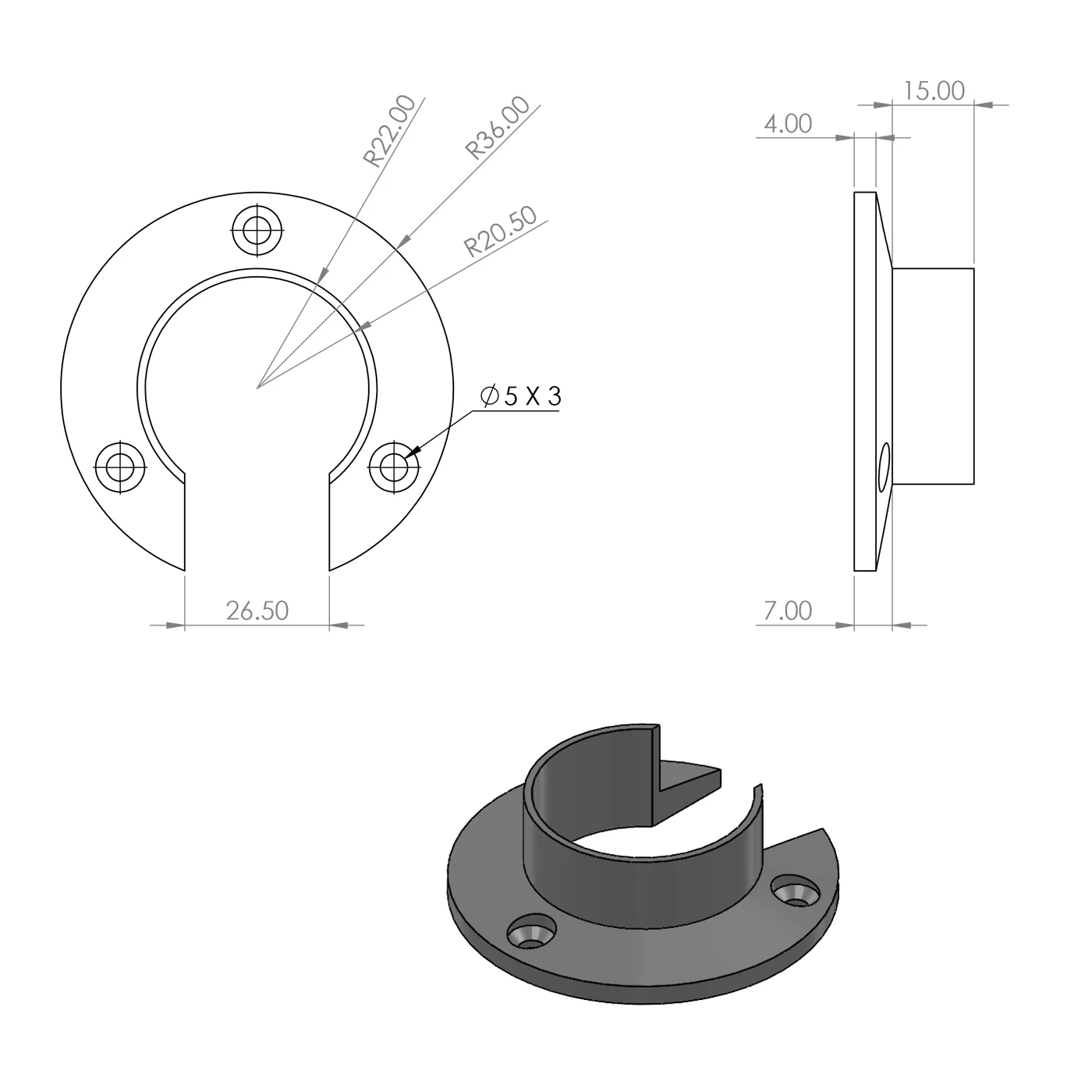 - Außenradius der Grundplatte (Flansch): R 36 mm (Grundplattendurchmesser 72 mm)