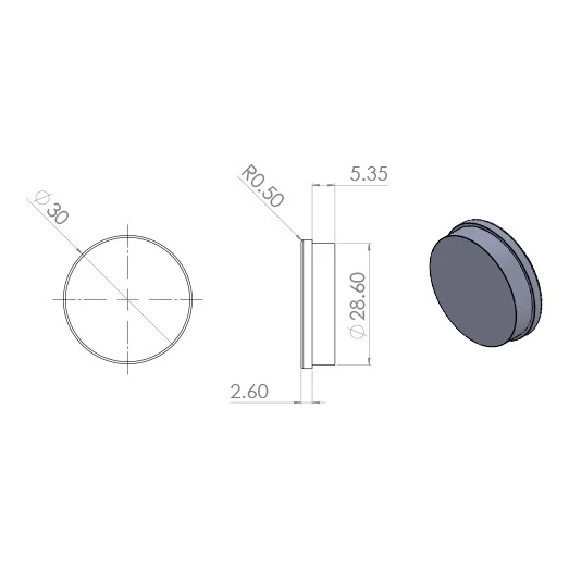 Die Abschlusskappe dient zum Verschließen der Montageöffnungen, die nach der Installation der Geländerprofile verbleiben. Die Unterseite des Elements ist mit konzentrischen Rillen ausgestattet, die eine sichere Fixierung in der Profilöffnung gewährleisten. Das Element wird direkt in die Öffnung eingepresst – es erfordert weder Klebung noch mechanische Befestigung, was die Abschlussarbeiten auf der Baustelle erheblich beschleunigt.