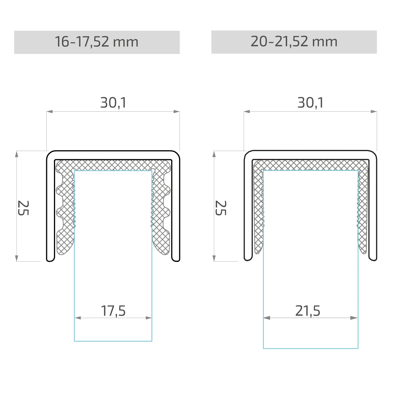 Der Handlauf arbeitet mit zwei Typen von austauschbaren Dichtungen zusammen, was die Montage auf Gläsern unterschiedlicher Stärken ermöglicht. Für Glas 16–17,52 mm wird eine Dichtung verwendet, die den Montagespalt auf 17,5 mm anpasst, während für Glas 20–21,52 mm eine Dichtung verwendet wird, die ihn auf 21,5 mm erweitert. Diese Flexibilität eliminiert die Notwendigkeit, separate Profile für verschiedene Projekte zu bestellen.