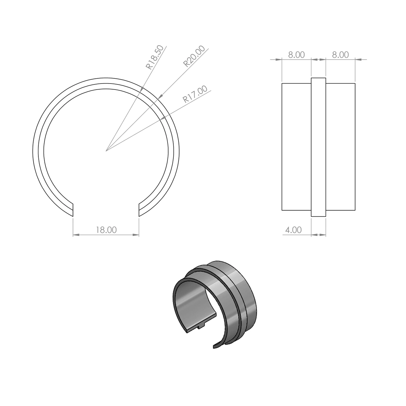 Der Radiusunterschied zwischen R18,50 und R17,00 schafft eine Abstufung, die für die stabile Befestigung des Handlaufs verantwortlich ist – das Element sitzt präzise ohne Spiel. Der zentrale Flansch mit Radius R20,00 mm und Dicke 4 mm fungiert als Anschlag und hält die Stütze in konstanter Position an der Scheibenkante. Die symmetrischen Einschiebsegmente von je 8 mm auf jeder Seite sorgen für gleichmäßige Unterstützung des Handlaufs und professionelles Aussehen der fertigen Balustrade.