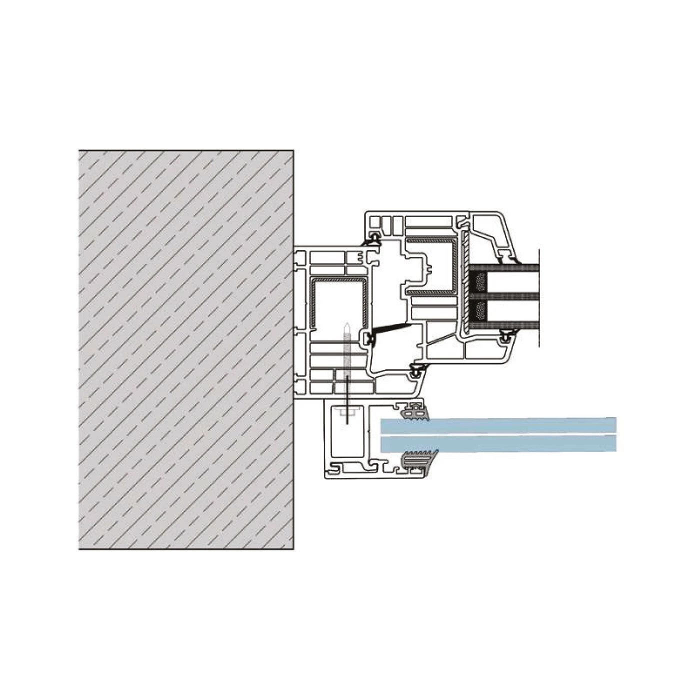 Die Schnittzeichnung zeigt das Detail der Verbindung des Aluminiumprofils mit dem Fensterrahmen und der Laibung. Das Profil wird direkt am Fenster befestigt – ohne Eingriff in die Wandkonstruktion. Das System gewährleistet eine ästhetische Ausführung von der Außenseite dank Abdeckleisten und Glasdichtung.