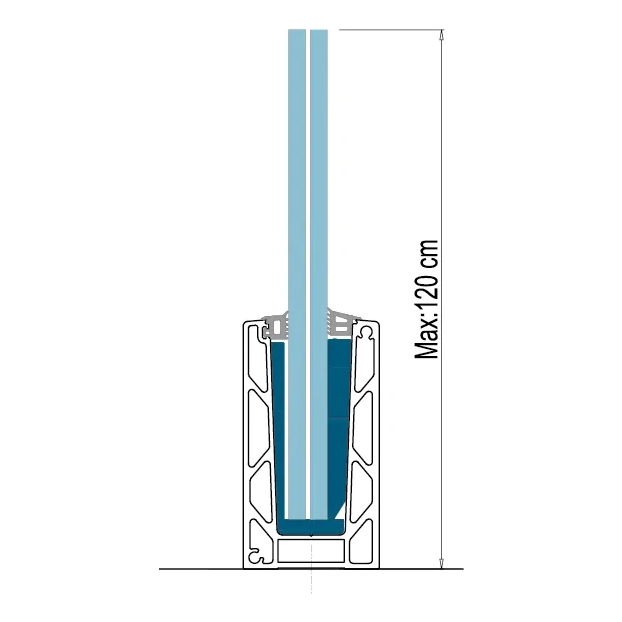 Das Profil KE 100 ermöglicht die Montage von Glasscheiben mit einer maximalen Höhe von 120 cm (1,2 m). Bei dieser Höhe behält das Profil seine volle Tragfähigkeit und Stabilität, was durch die Ergebnisse von Wind- und Stoßbelastungstests für die einzelnen Glasdicken bestätigt wird.