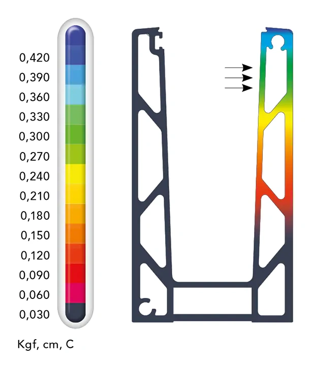 Die Ergebnisse der Verschiebungsanalyse mittels Finite-Elemente-Methode (FEM) bestätigen die hohe Steifigkeit der Konstruktion. Die Simulation wurde für ein Profil mit einer Basislänge von 1 m durchgeführt, bei einer horizontalen Belastung unter 500 kg (5000 N), von der Basis bis zum höchsten Punkt des Profils. Die maximale Verschiebung an der oberen Kante des Profils liegt innerhalb der zulässigen Grenzen (Werteskala von 0,030 bis 0,420 Kgf, cm, C), was die Gebrauchssicherheit des Geländers gewährleistet.