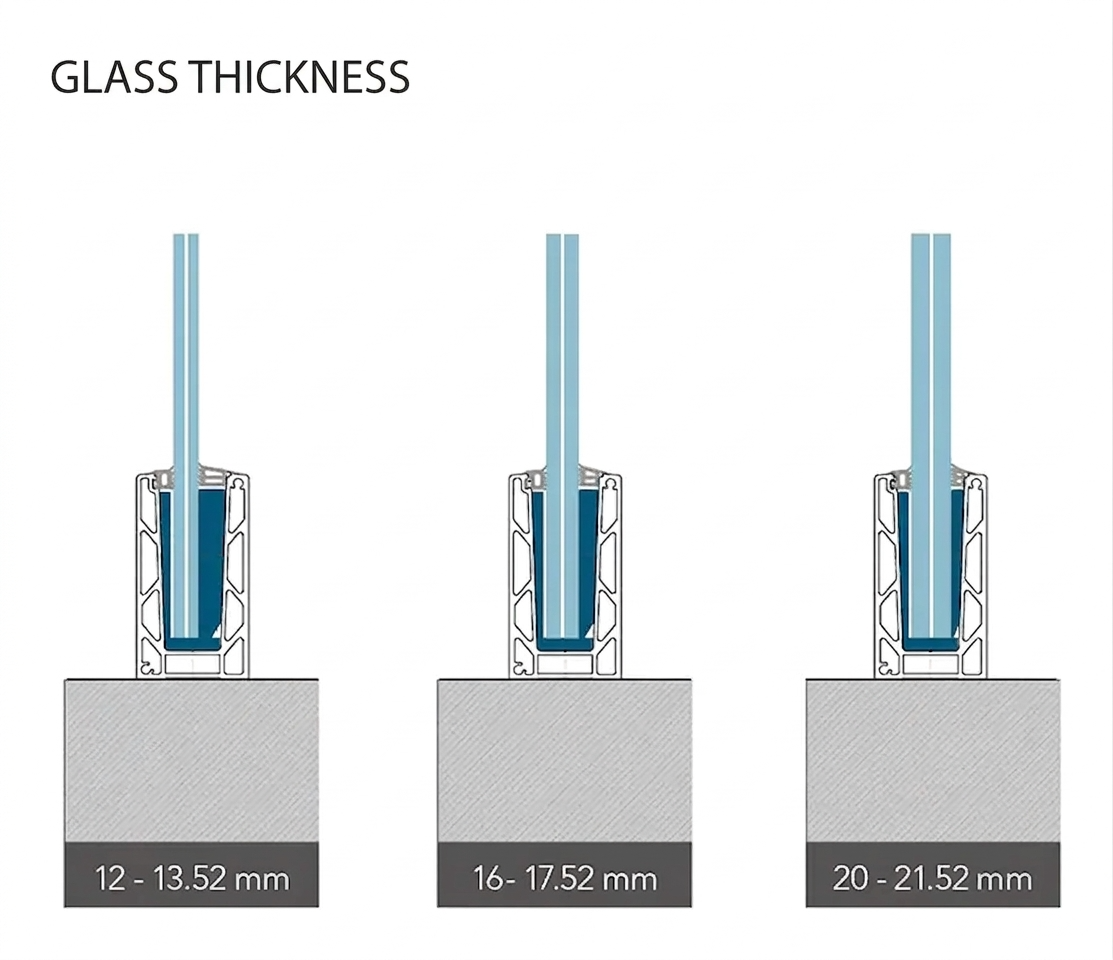 Das Profil KE 100 unterstützt drei Bereiche von Glasdicken, was eine Anpassung der Lösung an die Projektanforderungen und geltende Sicherheitsnormen ermöglicht:
