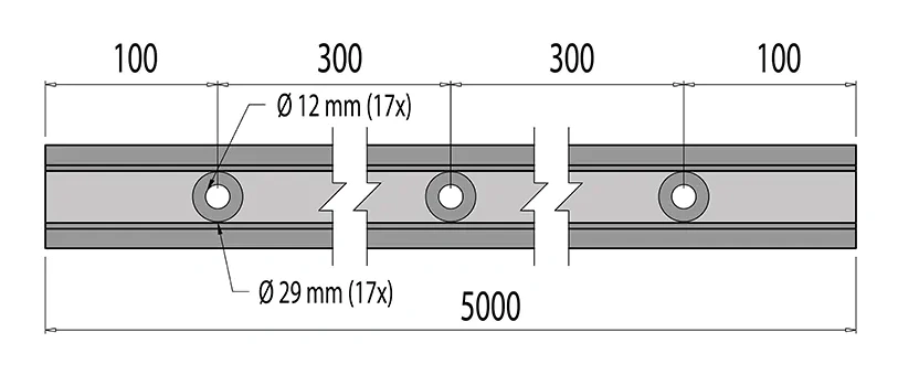 Das Profil verfügt über 17 durchgehende Löcher mit einem Durchmesser von Ø 12 mm und Vertiefungen von Ø 29 mm, die das Versenken des Schraubenkopfes ermöglichen. Die Löcher sind symmetrisch entlang der Profilachse angeordnet: