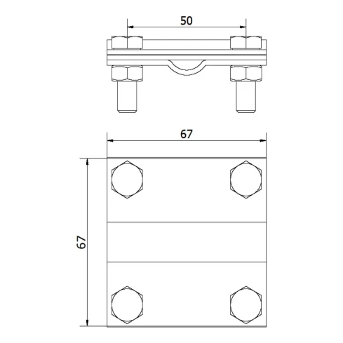 Die Abmessungen des Verbinders betragen 67 × 67 × 50 mm, was eine solide Bauweise bei gleichzeitiger voller Funktionalität gewährleistet. Die Bezeichnung B im Produktnamen bezieht sich auf die maximale Bandeisenbreite, die im Verbinder befestigt werden kann.