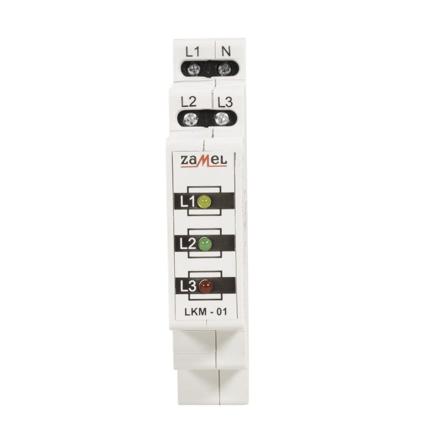 Er verfügt über drei helle LEDs mit den Bezeichnungen L1, L2, L3. Ein zusätzlicher Vorteil des Modells LKM-01-40 besteht darin, dass es in einem dreiphasigen TN-Netz eingesetzt werden kann, d.h. in einem Netz mit einem Nullleiter N. Das Gerät wird auf einer TH 35-Schiene montiert, so dass es an nicht standardisierte Anwendungen angepasst werden kann. Das einteilige Gehäuse und die langlebigen Leuchtelemente garantieren einen langen und zuverlässigen Betrieb der Anzeige.