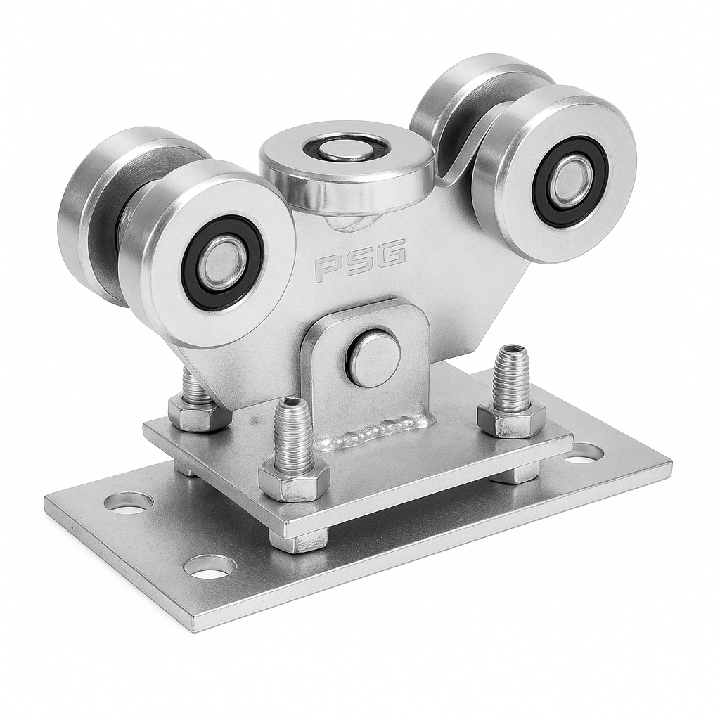 Laufwagen mit 5 Rollen für freitragende Schiebetore. Die schwenkbare Konstruktion mit 5 Stahlrollen (davon eine horizontale Rolle) sorgt für eine gleichmäßige Torführung und die automatische Anpassung an die Laufschiene. Der Wagen wird über einen Zapfen mit der Grundplatte verbunden, was freie Beweglichkeit und den Ausgleich etwaiger Spurabweichungen gewährleistet. Die Montagehöhe ist über Schrauben stufenlos einstellbar, sodass der Monteur das Tor vor Ort präzise ausrichten kann.