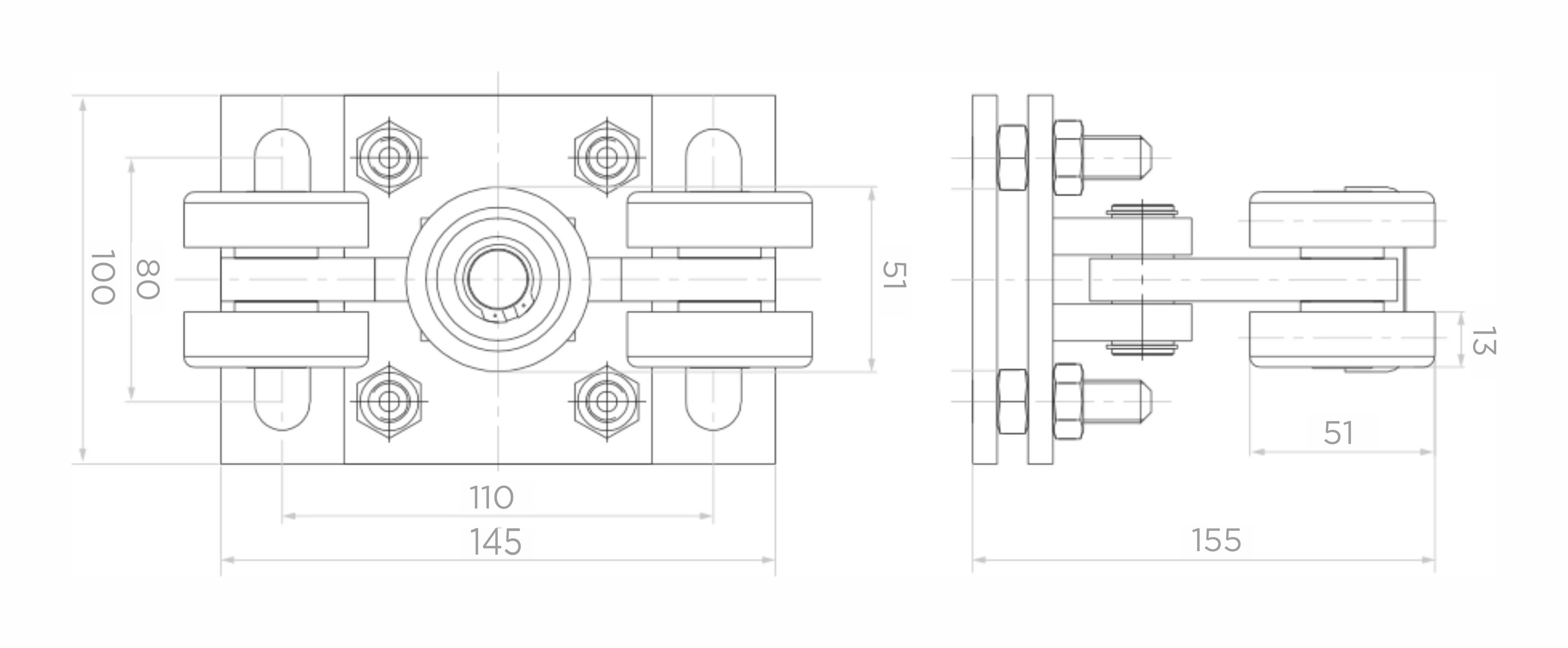 Der Laufwagen ist kompatibel mit einer Laufschiene der Abmessung 60×60×4 mm und damit ein universelles Element für die meisten auf dem Markt erhältlichen freitragenden Schiebetorsysteme.