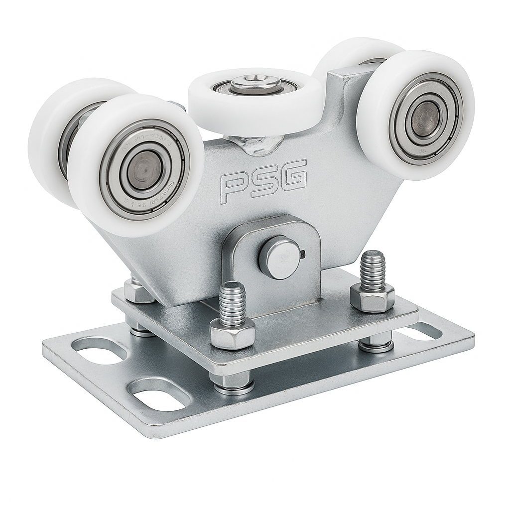 Der Laufwagen ist mit 5 Kunststoffrollen ausgestattet, darunter eine horizontale Rolle, die eine gleichmäßige und geräuscharme Torbewegung gewährleisten. Die Pendelkonstruktion — der Wagen ist über einen Zapfen mit der Grundplatte verbunden — sorgt dafür, dass er sich automatisch an das Schienenprofil anpasst. Die Höhenverstellung mittels Schrauben ermöglicht eine präzise Ausrichtung des Tores. Der Laufwagen ist für die Schiene 70×70×4 mm ausgelegt. Die gesamte Konstruktion ist aus verzinktem Stahl gefertigt, was Korrosionsbeständigkeit und eine langlebige Nutzung im Außenbereich garantiert.