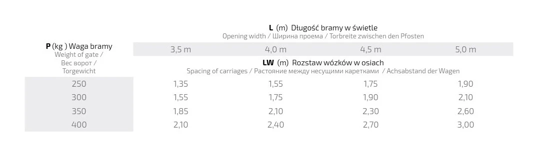 Der korrekte Achsabstand der Laufwagen (LW) hängt vom Torgewicht (P) und der lichten Breite der Toröffnung (L) ab. Die folgende Tabelle zeigt die empfohlenen Werte: