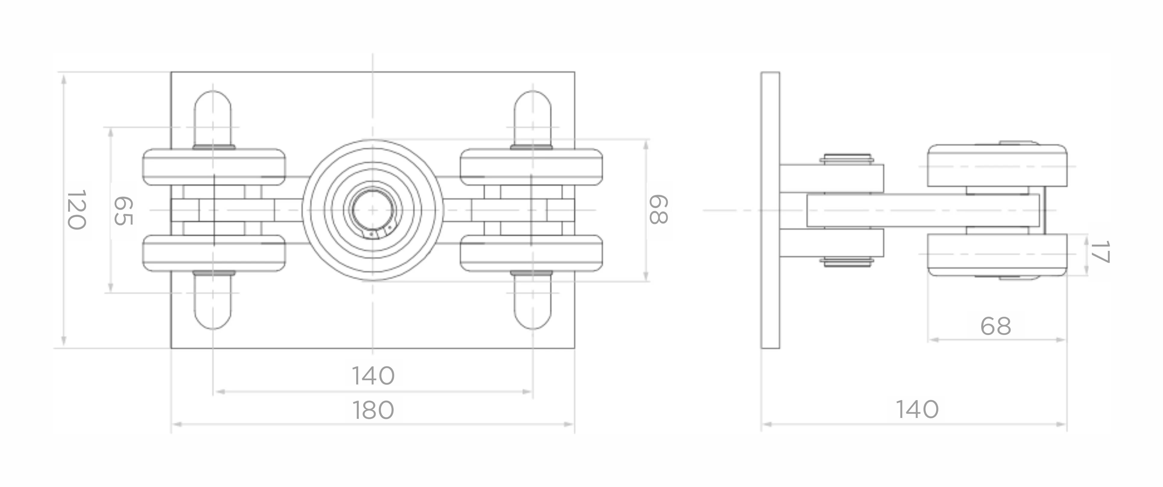 Der Laufwagen ist kompatibel mit einer Laufschiene mit dem Querschnitt 80 × 80 × 5 mm. Die stabile, massive Grundplatte mit Langlöchern (Bohrlöcher) ermöglicht eine präzise Positionseinstellung des Laufwagens auf dem Fundament, was die Montage beschleunigt und die Ausrichtung der Laufbahn erleichtert.
