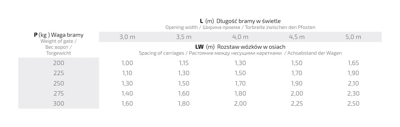 Der korrekte Laufwagenabstand (LW) hängt von der lichten Torbreite (L) sowie dem Torgewicht (P) ab. Die nachfolgende Tabelle zeigt die empfohlenen Abstände der Laufwagen in Metern, die einen optimalen Betrieb und eine lange Lebensdauer des Systems gewährleisten: