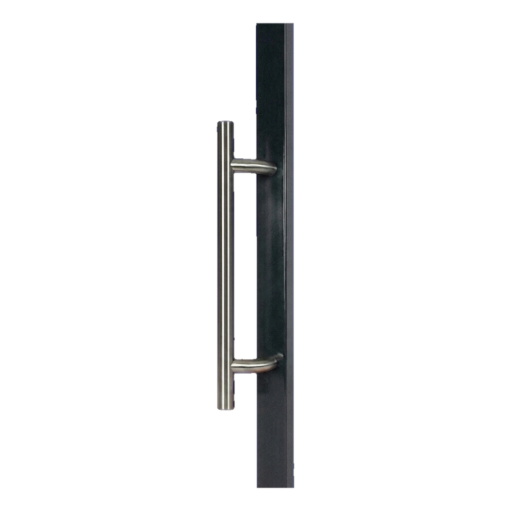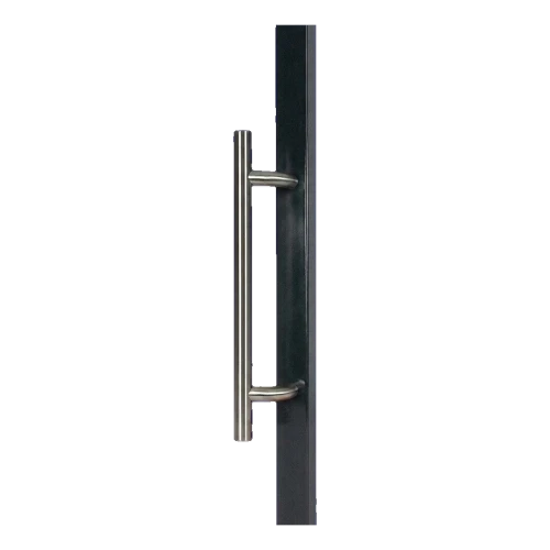 Der Griff wird mittels zweier Arme montiert, die mit Verankerungszapfen mit einem Durchmesser von Ø22 mm abschließen und in Bohrungen im Torprofil eingesetzt werden. Die Zapfen werden mit Klemmschrauben (sog. Madenschrauben) blockiert, was eine schnelle Montage ohne Schweißen ermöglicht. Der Befestigungsabstand beträgt 300 mm, und der Neigungswinkel der Arme von 60° gewährleistet einen ergonomischen Griff und ein ästhetisches Aussehen am Profil.